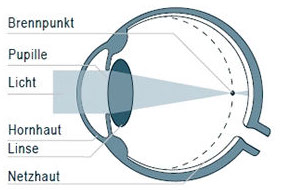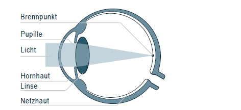 Das Auge funktioniert im Grunde wie eine Art Kamera. Das einfallende Licht wird von der Hornhaut und der Linse so abgebildet, dass auf der Netzhaut ein scharfes Bild entsteht. Die dort auftreffenden Lichtstrahlen werden in elektrische Reize umgewandelt und über die Sehnerven in unser Gehirn weitergeleitet.
