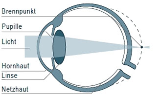 Kurzsichtige Menschen sehen Gegenstände in der Nähe scharf und in der Ferne unscharf. Der Brennpunkt des Lichts bei Normalsichtigen befindet sich auf der Netzhaut. Da das Auge beim Kurzsichtigen zu lang ist, wird das Licht bereits vor der Netzhaut gebündelt. (Starke Korrekturbrillen führen zu Bildverzerrungen,
